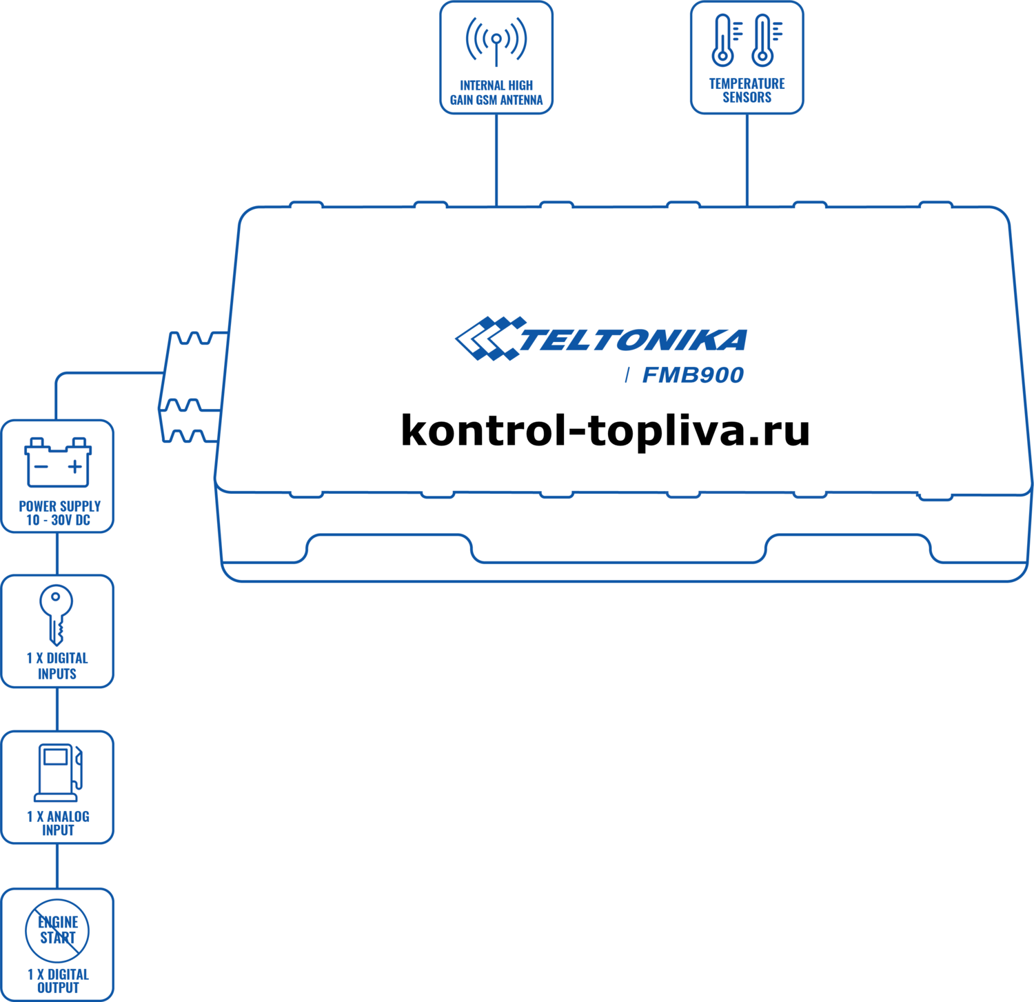 1 цифровой вход 1 Аналоговый вход 1 Цифровой выход с открытым коллектором (подключение внешних реле, светодиодов, звуковых сигналов и т. Д.) Встроенный акселерометр Питание (+ 6 ... + 30) V DC с защитой от перенапряжения Внутренняя антенна GNSS с высоким коэффициентом усиления Внутренняя антенна высокого усиления GSM